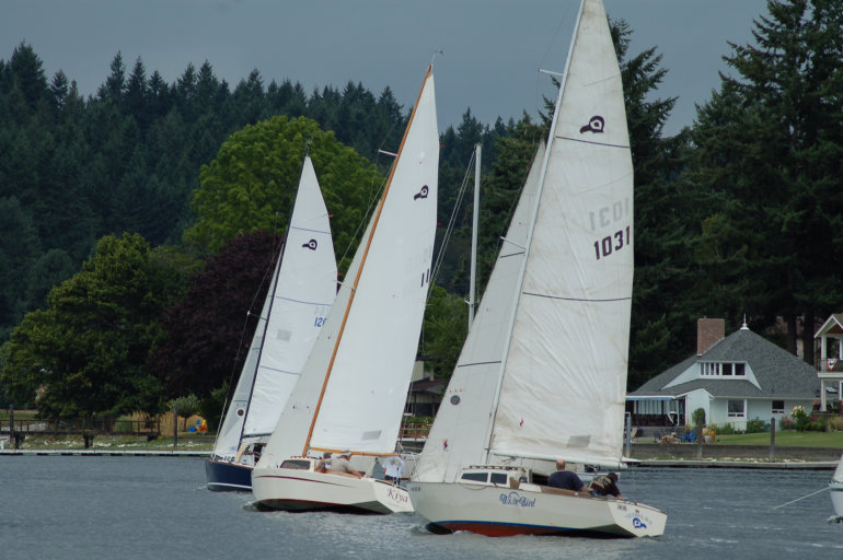 While Saturday, July 25, brought a welcome respite to the 90 F heat wave  that enveloped Western Washington, the racing at the T-Bird Rendezvous and Regatta sizzled. Twelve “Birds” convened at their primordial home, the Gig Harbor BoatShop for some low key racing and high level partying. The event was co-hosted by Thunder bird Fleet 1 and the Gig Harbor Boat Shop and both groups are looking forward to more cooperation and collaboration.
